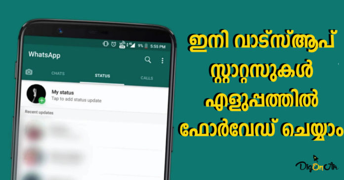 എന്നാലും അവരോട് ചോദിച്ചാൽ അവർക്ക് അത് എടുത്ത് അയച്ച് തരാനുളള മടിയുണ്ടാകും കാരണം ആ ഫയൽ തപ്പി പിടിച്ച് കൊടുക്കാനുളള പ്രയാസമാണ്.എന്നാൽ വാട്സാപ്പിന്റെ ഏറ്റവും പുതിയ അപ്ഡേറ്റിൽ നമ്മൾ വെക്കുന്ന സ്റ്റാറ്റസുകൾ സ്റ്റാറ്റസ് സെക്ഷനിൽ തന്നെ മറ്റൊരാൾക്ക് ഷെയർ ചെയ്യാനാകും.അതോടൊപ്പം തന്നെ നമ്മുടെ സ്റ്റാറ്റസുകൾ ഫെയ്സ്ബുക്കിലേക്ക് ഷെയർ ചെയ്യാനും സാധിക്കും. ഇതിനായി സ്റ്റാറ്റസ് സെക്ഷനിൽ പോയി നമ്മൾ വെച്ച സ്റ്റാറ്റസിന് നേരെ കാണുന്ന മൂന്ന് ഡോട്സിൽ ക്ലിക്ക് ചെയ്താൽ ഓപ്ഷനുകൾ വരും അതിൽ ഫോർവേഡ് ബട്ടൺ ക്ലിക്ക് ചെയ്താൽ നമുക്ക് ആ സ്റ്റാറ്റസ് മറ്റൊരാൾക്ക് ഷെയർ ചെയ്യാനാകും
